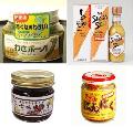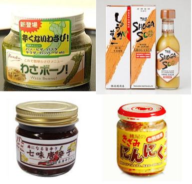 左上から時計周りに わさボーノ,しょうがすこ,桃屋 お料理用きざみにんにく,生七味唐辛子である(但し,雑誌『Mart』で調査したものであり,()内は使用している香辛料である) | ||